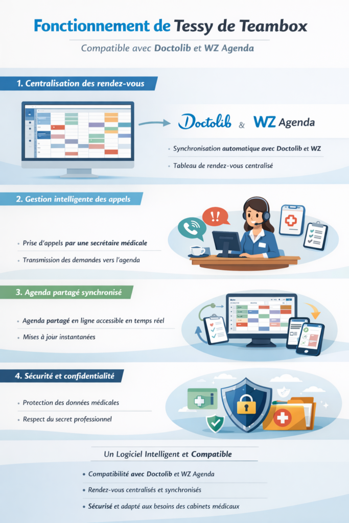 J’utilise le logiciel reconnu Tessy de Teambox, parfaitement adapté aux besoins des professionnels de santé. Ce logiciel est couplé à un agenda partagé en ligne, accessible en temps réel, permettant une organisation fluide et sécurisée de vos rendez-vous.